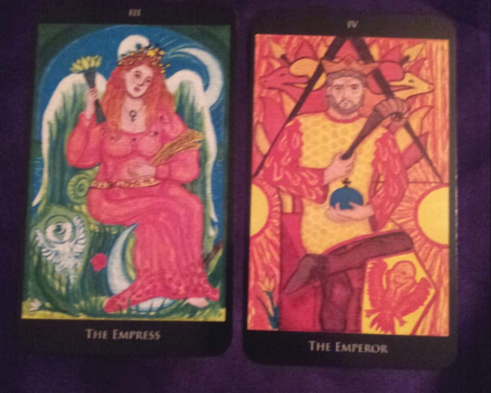 Today’s Tarot is the Empress (Venus) and the Emperor (Aries, i.e. ruled by Mars) from the richly colored Rosetta Tarot – so it’s the perfect Tarot couple! Mom and Dad, both represented. Yin and yang, yielding and assertive, passive and active.