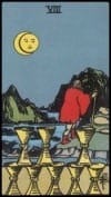 Well, this is the perfect compliment to yesterday’s admonition for self-care in the face of disruption. Pulling back and turning inward allows perspective and healing to occur. And notice the significant difference from the RWS version? The idea is the same—leaving behind emotions as signified by the 8 cups on the shore. But there is less sadness in “Emotional Withdrawal” as there is in the traditional Eight of Cups.