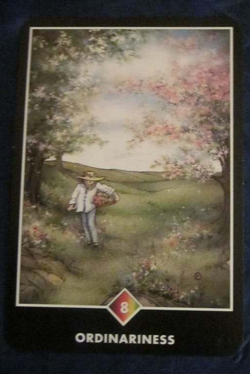 Today’s Tarot forecast is “Ordinariness,” aka the Eight of Pentacles (Rainbows) from the Osho Zen. I love this particular image—as the woman walks down the path after doing some gardening, she’s surrounded by the fruit of her efforts, right there.