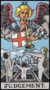 People are often afraid of this card—not the Tarot Nova positive-spin-sanitized butterfly so much, but the RWS Zombie parade, yes! At it’s heart, Judgment is not about Zombies. The angel’s trumpet, however, does announce the day of reckoning. Situations current or long gone, doesn’t matter. Judgment shines light on circumstance we may have thought long dead and buried.