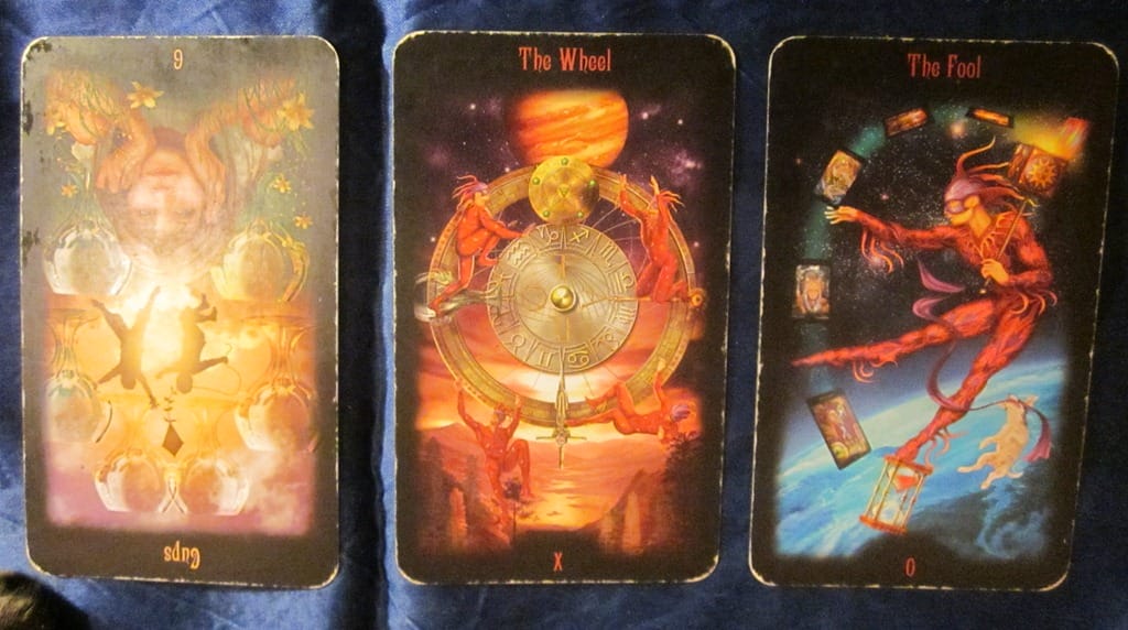 Today’s Tarot forecast is a 3-card spread from the lovely Legacy of the Divine deck: reversed Six of Cups (Sun in Scorpio), the Wheel (Jupiter), and the Fool (Uranus).